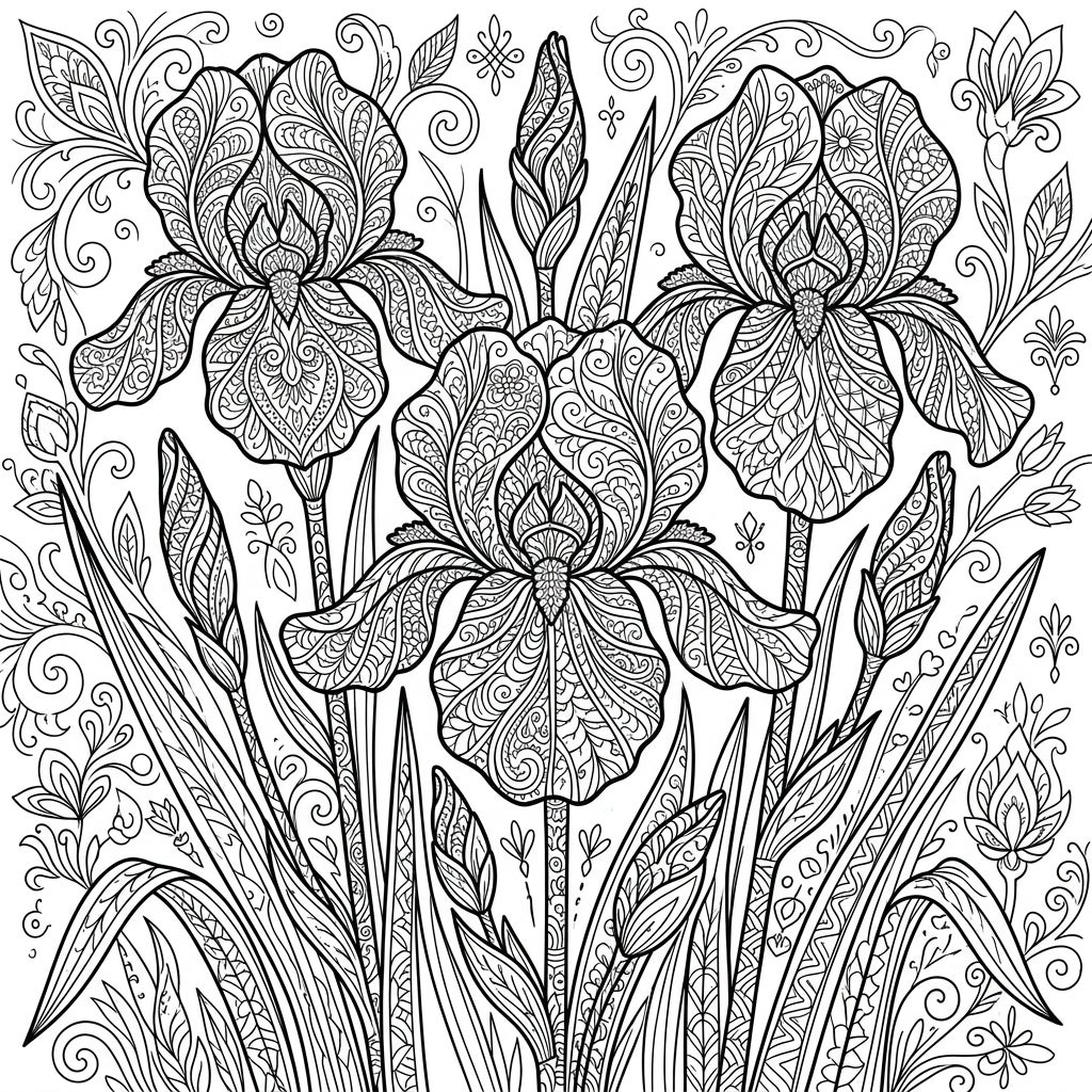 Unleash your creativity with this stunning coloring page featuring elegant Japanese Irises rendered in the intricate Zentangle style. Each petal and leaf offers a meditative canvas for detailed coloring, perfect for adults seeking relaxation.