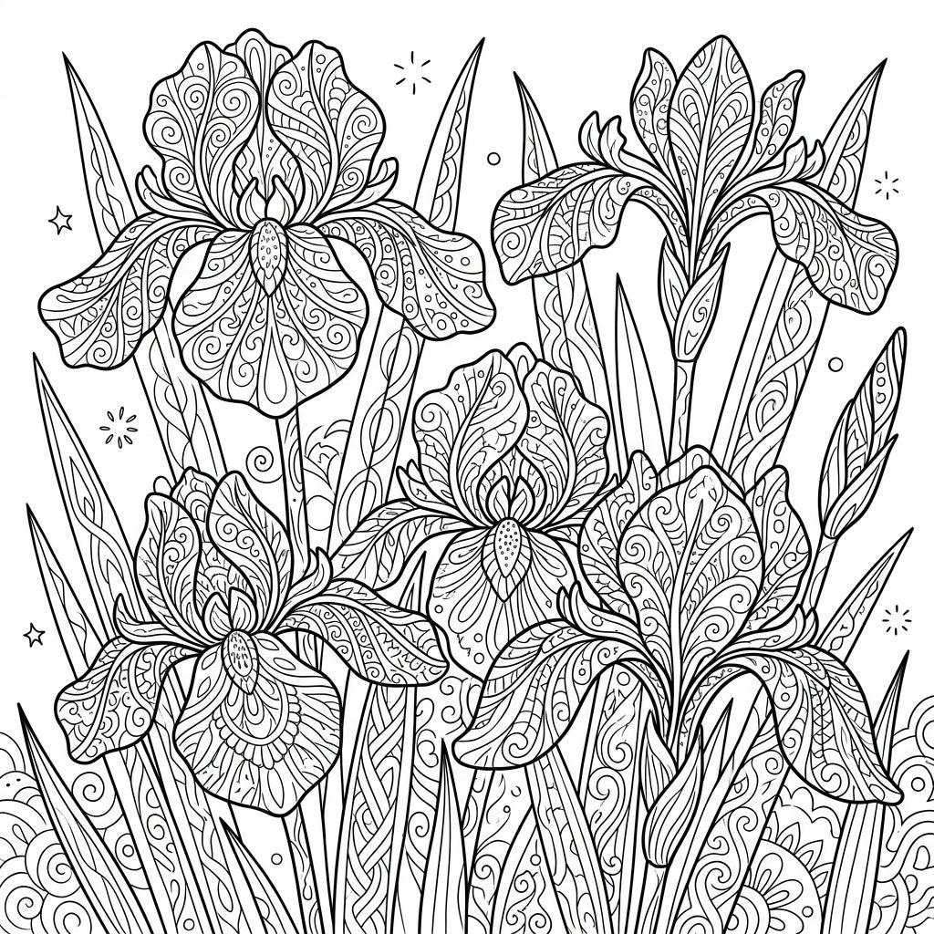 Dive into a world of exquisite detail with our Japanese Irises Zentangle coloring page. This stunning design showcases several majestic iris blooms, each petal intricately filled with a mesmerizing array of Zentangle patterns. From swirling mandalas to delicate geometric shapes, every element invites your eye to explore the depth and complexity of these artistic botanical forms. The surrounding foliage also incorporates subtle Zentangle motifs, creating a cohesive and richly textured scene that is a feast for the eyes even before color is added.
