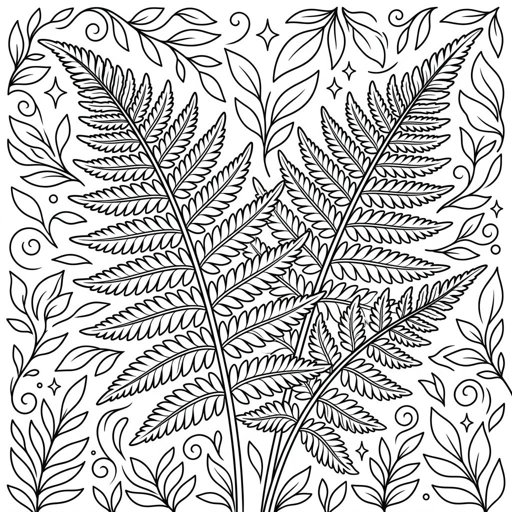 Unveil the intricate beauty of the Japanese Painted Fern with this delightful coloring template. This illustration showcases the fern's characteristic broad fronds, each segment intricately outlined, ready for a burst of color. Surrounding the main fern are whimsical smaller leaves, graceful swirls, and sparkling accents, all designed with balanced line weights to make coloring both enjoyable and manageable for little hands.