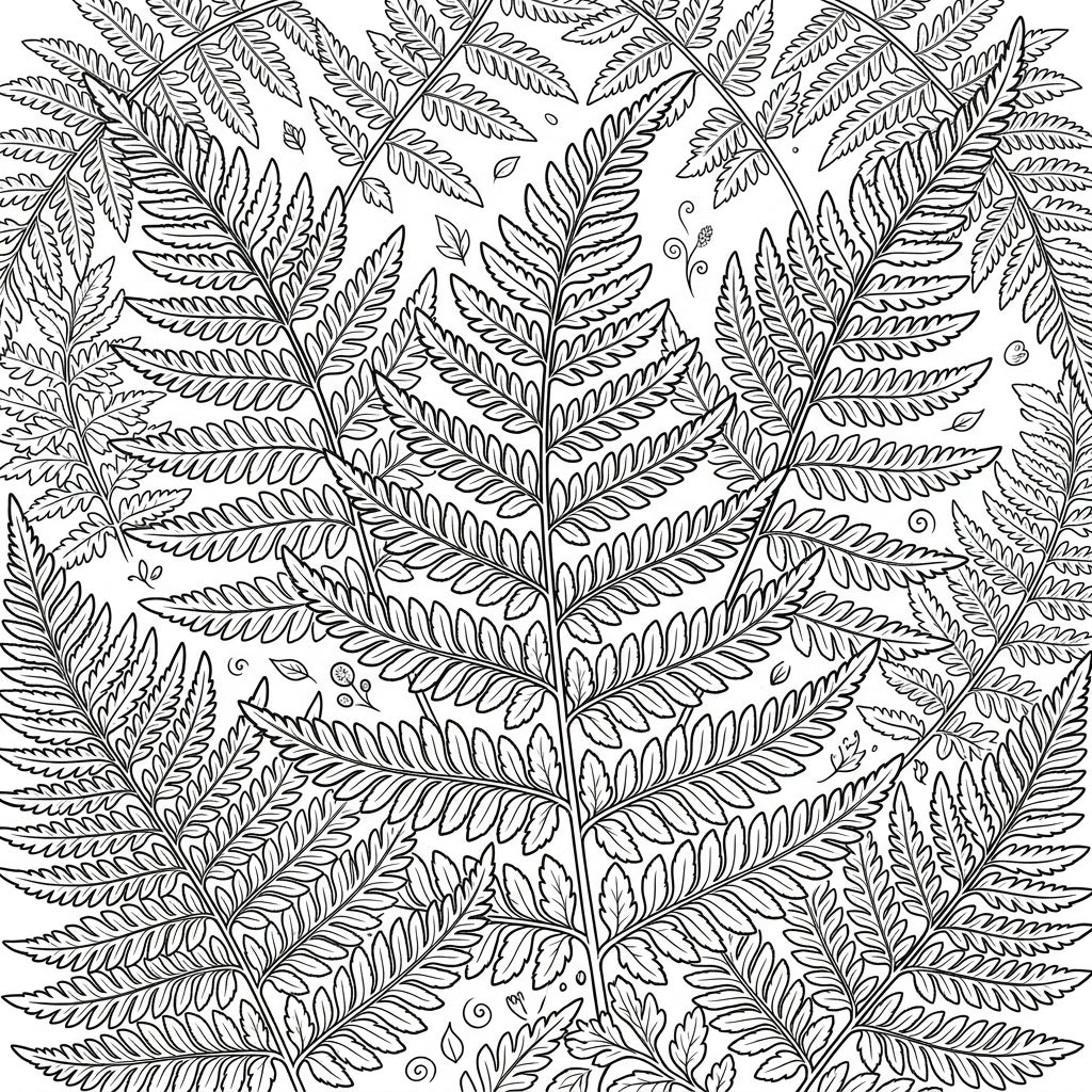 Delve into the lush world of nature with this captivating Japanese Painted Fern coloring template. The design showcases several striking fronds, layered and intertwined to fill the entire page with organic beauty. Each pinna (leaflet) is finely detailed, inviting you to explore the subtle textures and graceful curves of this popular ornamental plant. Scattered amongst the larger fronds, you'll discover smaller individual leaves and whimsical botanical swirls, adding depth and discovery to your coloring journey.
