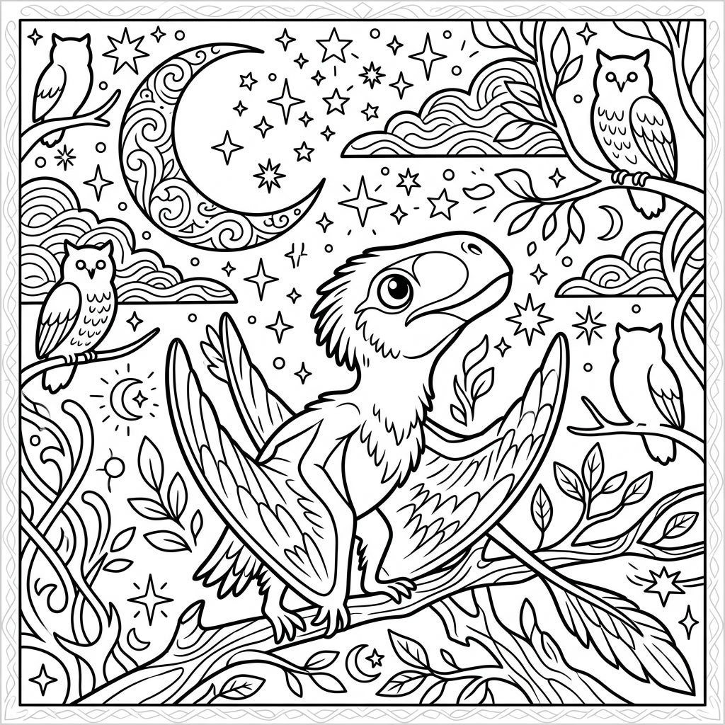 Embark on a nighttime adventure with this charming Jeholopterus pterosaur coloring page, set under a sky full of an ornate moon and twinkling stars. Discover hidden owls and intricate foliage, making it a perfect creative escape for all ages.