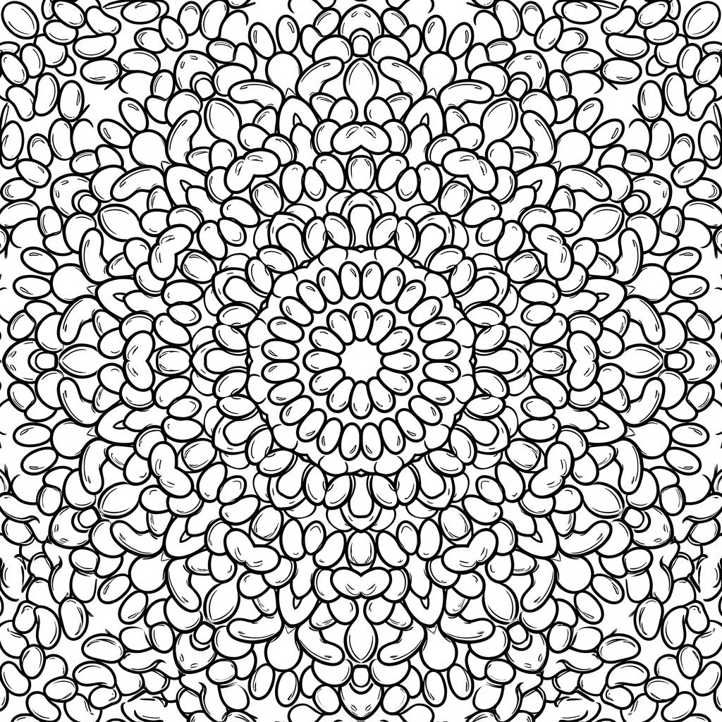 Discover the captivating allure of our Jelly Bean Mandala coloring page, where sweetness meets intricate design. This unique template features a perfectly symmetrical radial pattern, meticulously constructed from countless oval-shaped jelly beans. Each candy is rendered with clean lines, forming layers and spirals that emanate from a central focal point, creating a dense and mesmerizing visual tapestry that invites exploration.