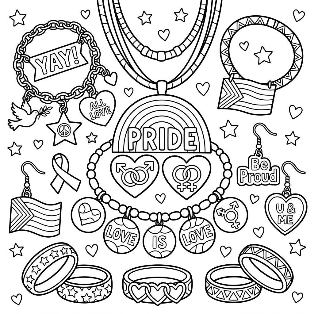 This captivating coloring page is bursting with an assortment of beautiful jewelry, all waiting for a splash of color! Discover a central necklace with a bold 'PRIDE' rainbow pendant, alongside a charming bracelet adorned with 'LOVE IS LOVE' medallions and heart symbols representing diverse connections. Elsewhere, a delightful charm bracelet features 'YAY!', 'ALL LOVE,' peace signs, and a gentle dove, while playful earrings sport messages like 'Be Proud' and 'U & ME,' along with miniature flags. Intricate rings with patterns of hearts, stars, and chevrons complete this celebratory collection, inviting young colorists to bring each piece to life.