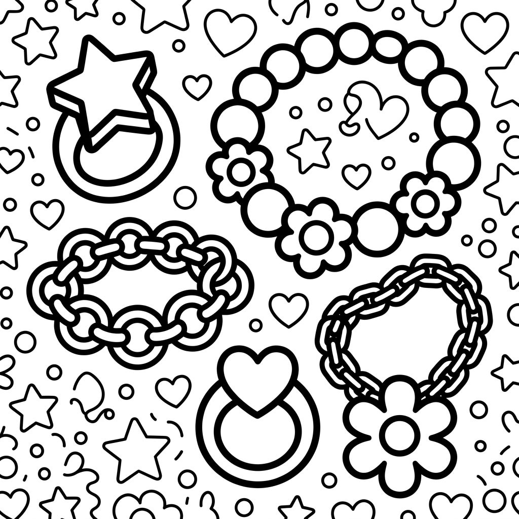 Dive into a world of dazzling accessories with our charming Toddler Jewelry coloring page! This delightful design showcases five prominent pieces of jewelry, including a star-shaped ring, a heart-shaped ring, a beautiful beaded bracelet adorned with playful flowers, and two distinct chain bracelets. Each item is drawn with ultra-thick lines and generous coloring areas, making it incredibly easy for tiny hands to stay within the lines. The background is playfully scattered with an array of small hearts, stars, and circles, providing extra details for your little one to discover and color.