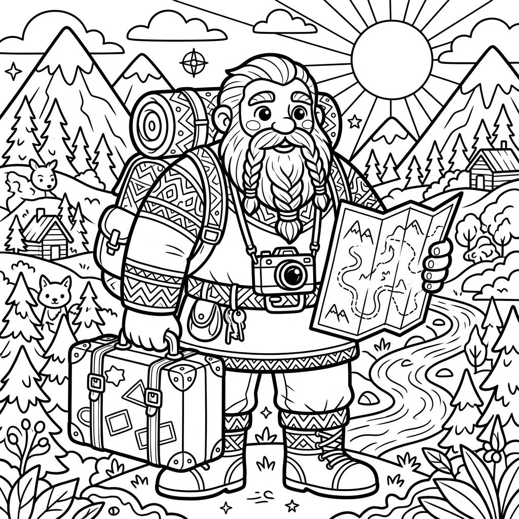 Get ready for an epic coloring journey with our friendly Jotunn giant! This detailed illustration features a benevolent Norse giant, complete with a magnificent braided beard and a warm smile, fully geared for a mountain adventure. He's sporting a large, intricately patterned backpack, a vintage camera ready to capture memories, and a trusty suitcase in hand, while eagerly consulting a map to guide his way through the scenic wilderness.
