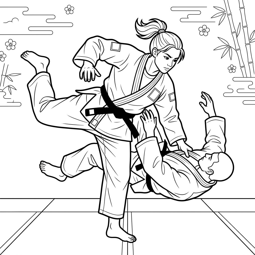 Step into the dojo with this captivating minimalist line art coloring page, showcasing two judokas locked in a moment of intense action. The design beautifully captures the grace and power of judo, with one martial artist executing a precise throw while their opponent skillfully prepares to break their fall. Every line is clean and deliberate, highlighting the forms of their traditional gis and the focused expressions on their faces. The backdrop features subtle, elegant elements like swaying bamboo and delicate cherry blossoms, adding an authentic, serene atmosphere to the dynamic scene.