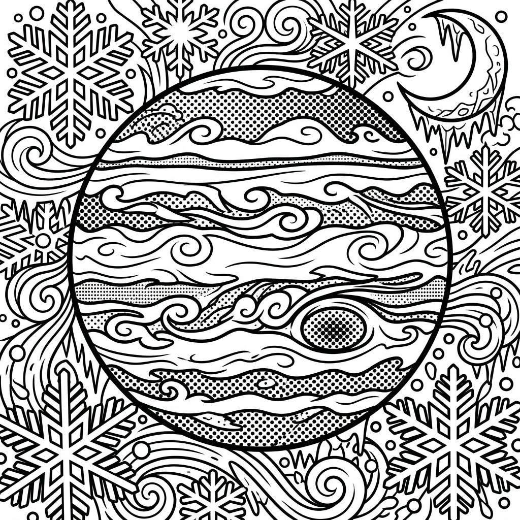 Embark on a unique cosmic journey with this Pop Art Jupiter coloring page, featuring the gas giant amidst a whimsical winter wonderland. Its bold lines and halftone patterns offer a dynamic canvas for your creative winter palette.