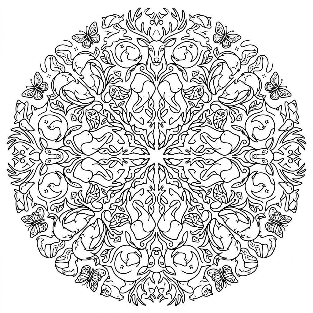 Immerse yourself in a captivating world of symmetrical wildlife with this intricate kaleidoscope animals coloring page. Discover a stunning array of deer, rabbits, foxes, owls, and butterflies woven into a beautiful mandala design, ready for your creative touch.
