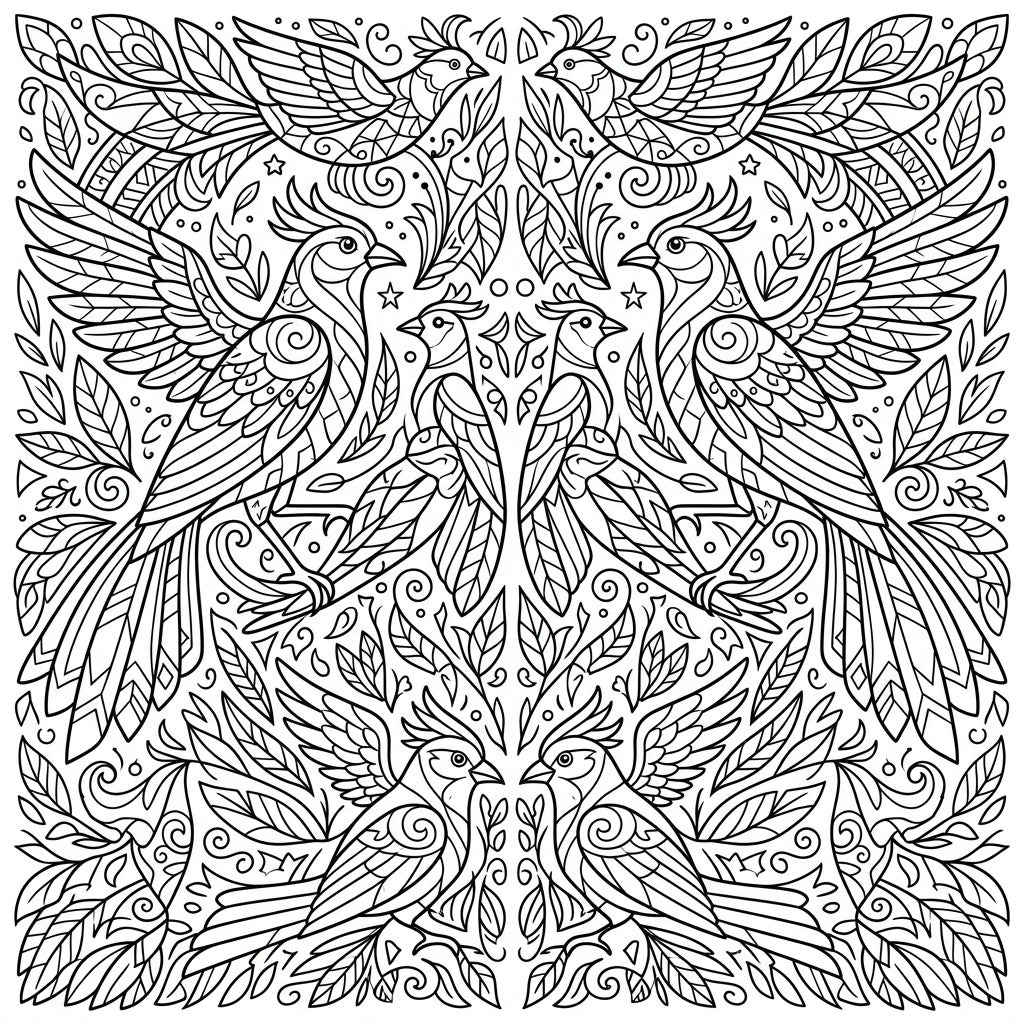 This extraordinary coloring page presents a mesmerizing kaleidoscope of birds, meticulously designed for young coloring enthusiasts. The artwork features a stunning symmetrical arrangement where four majestic birds with elaborate wings are mirrored by four smaller birds, creating a visually rich pattern. Swirls of elegant leaves, delicate vines, and tiny twinkling stars fill the background, inviting children to explore every intricate detail and bring this avian wonderland to vibrant life.