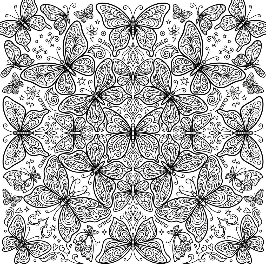 Step into a realm of intricate beauty with our Kaleidoscope Butterflies coloring template. This stunning design features a mesmerizing arrangement of butterflies, meticulously patterned to create a captivating kaleidoscopic effect. Each butterfly boasts incredibly detailed wings adorned with swirls, dots, and delicate lines, inviting you to explore every tiny corner with your chosen colors. Smaller accent butterflies, stars, and floral elements weave throughout the larger patterns, adding depth and charm to this symmetrical masterpiece.