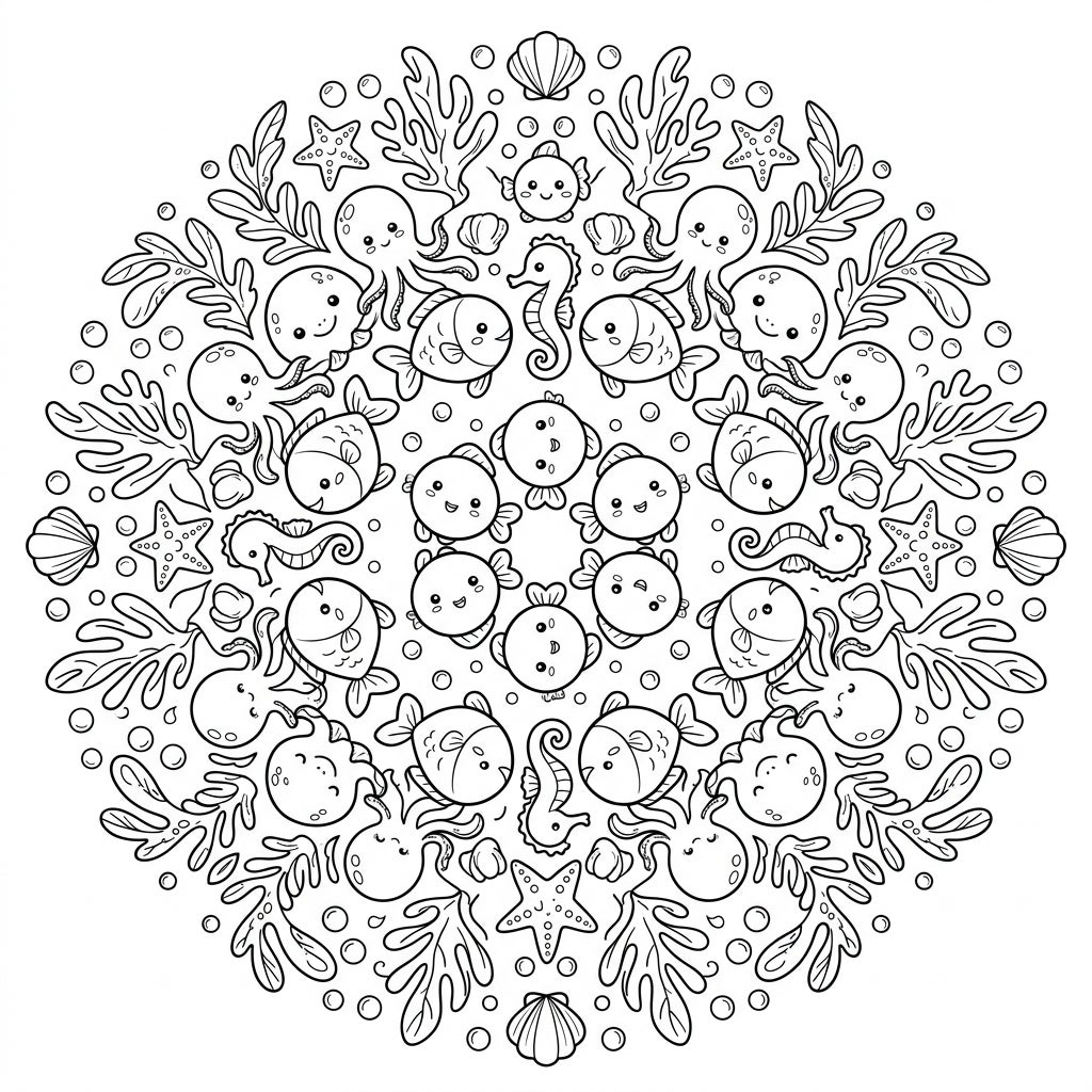Immerse yourself in an adorable underwater world with this captivating Kawaii Kaleidoscope Fish coloring page. Featuring a stunning radial design filled with cute sea creatures, it promises hours of creative fun.