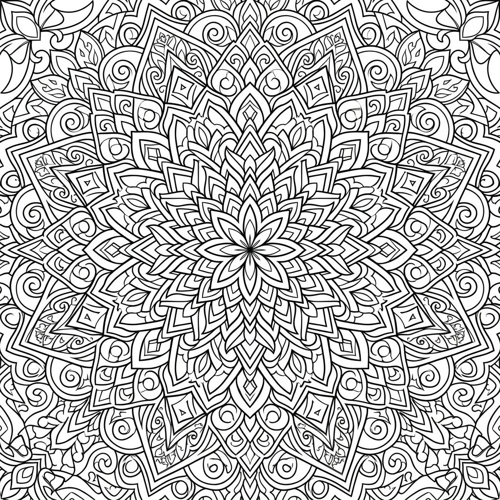 Discover the mesmerizing beauty of kaleidoscope patterns with this intricate radial design, perfect for a relaxing and engaging coloring experience. Explore symmetrical shapes and fine lines, transforming this blank canvas into a vibrant masterpiece.