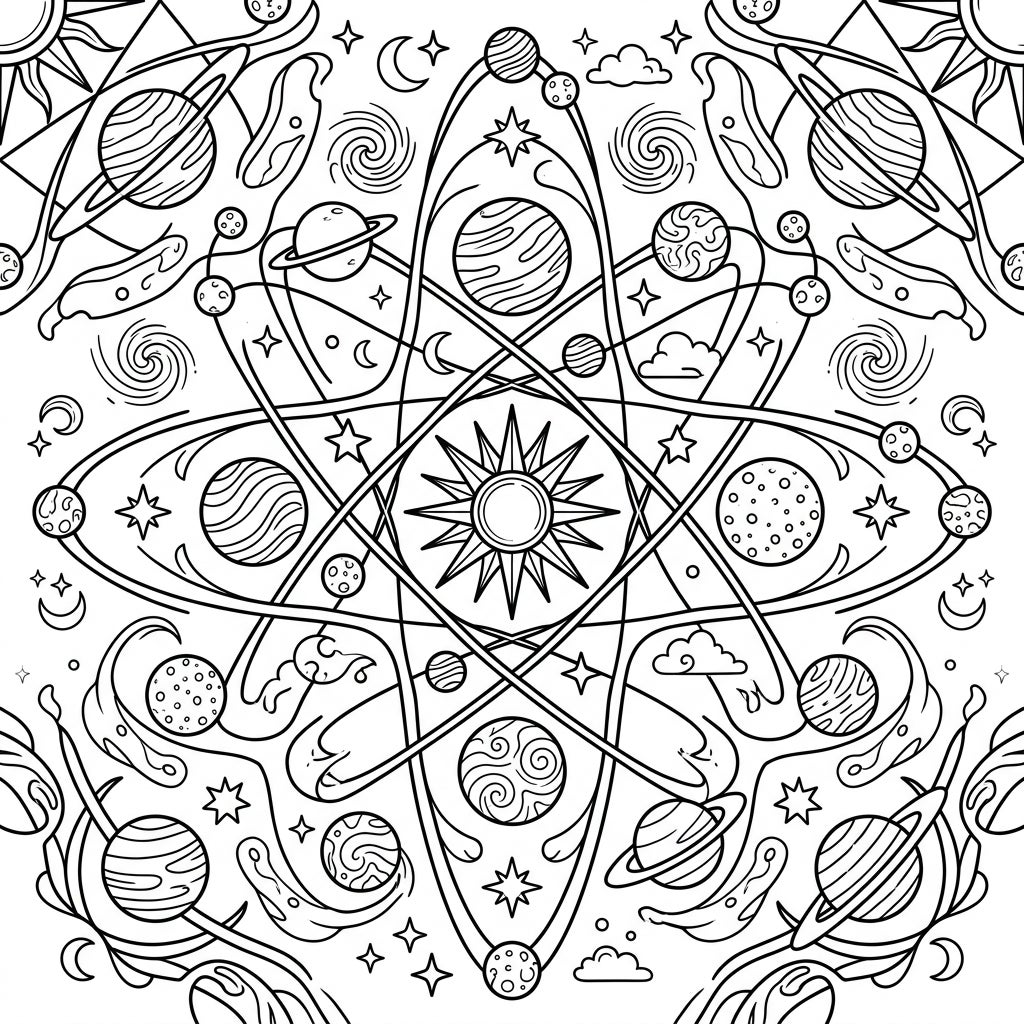 Dive into an amazing cosmic journey with our Kaleidoscope Planets coloring page, specially crafted for young explorers! This intricate design showcases a mesmerizing symmetrical pattern, centered around a radiant star, encircled by a ballet of planets. Each planet, some with rings like Saturn and others with swirling patterns or craters, is interconnected by elegant orbital lines, creating a visual feast that's both educational and endlessly fun to color.