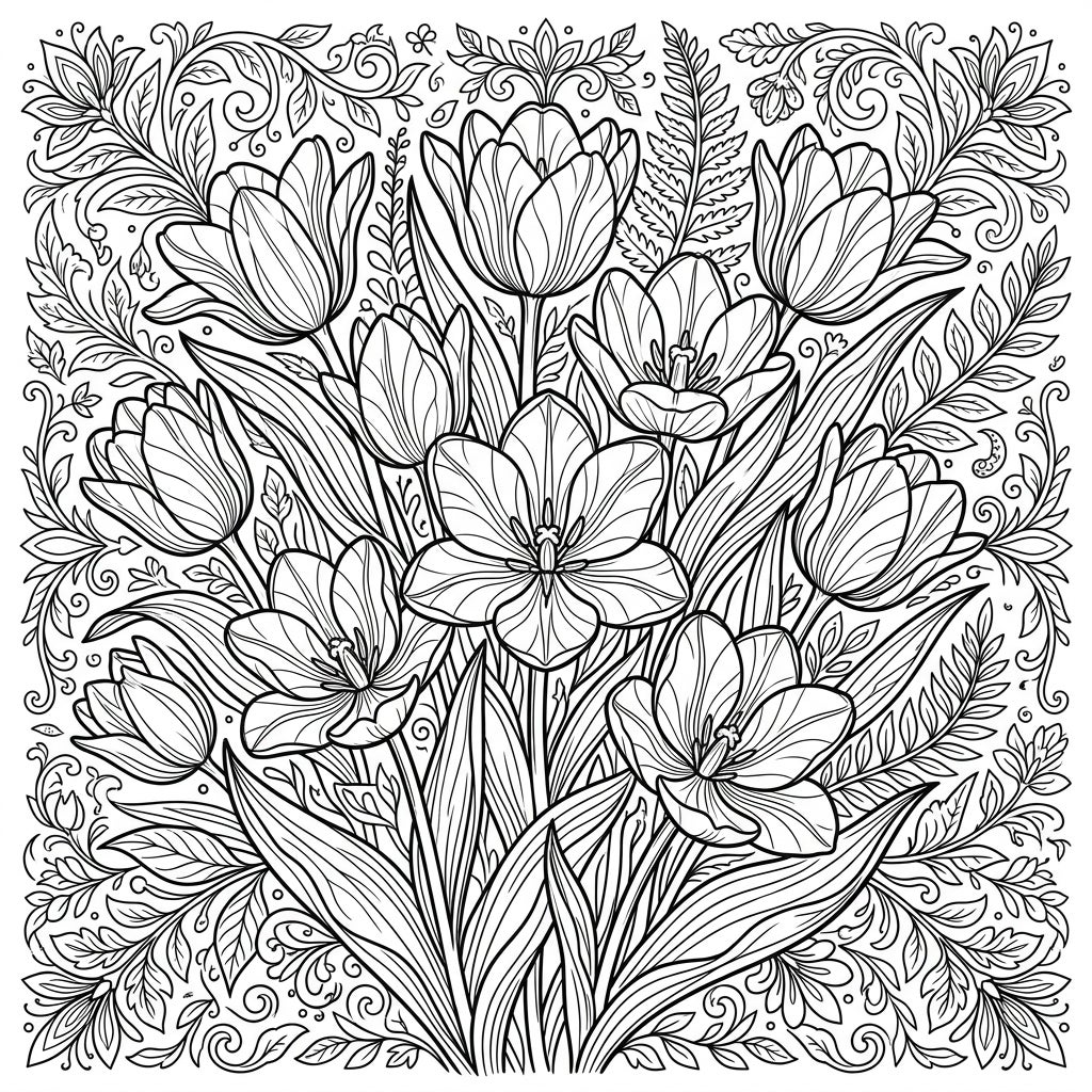 Designed specifically for teens, this coloring template offers a perfect blend of challenge and relaxation. The complex composition encourages mindfulness and provides a sophisticated outlet for creative expression, moving beyond simpler designs to truly engage your artistic skills. Explore the serene world of these early-blooming tulips, known for their vibrant spring hues, and let their natural elegance inspire your color choices.