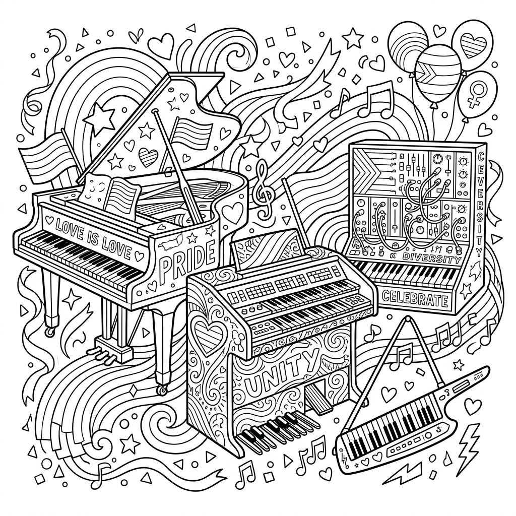Immerse yourself in a symphony of colors with this unique keyboard instruments coloring page, celebrating the spirit of Pride. Discover intricately designed pianos, organs, and synthesizers, all infused with messages of love, unity, and diversity.