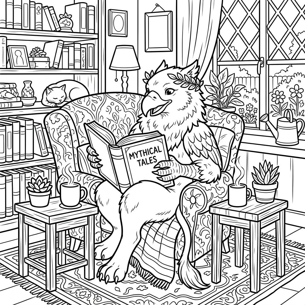 Settle into a world of mythical tranquility with this charming Keythong coloring page. Discover a wingless griffin enjoying a serene weekend, engrossed in a book within a cozy, detailed room.