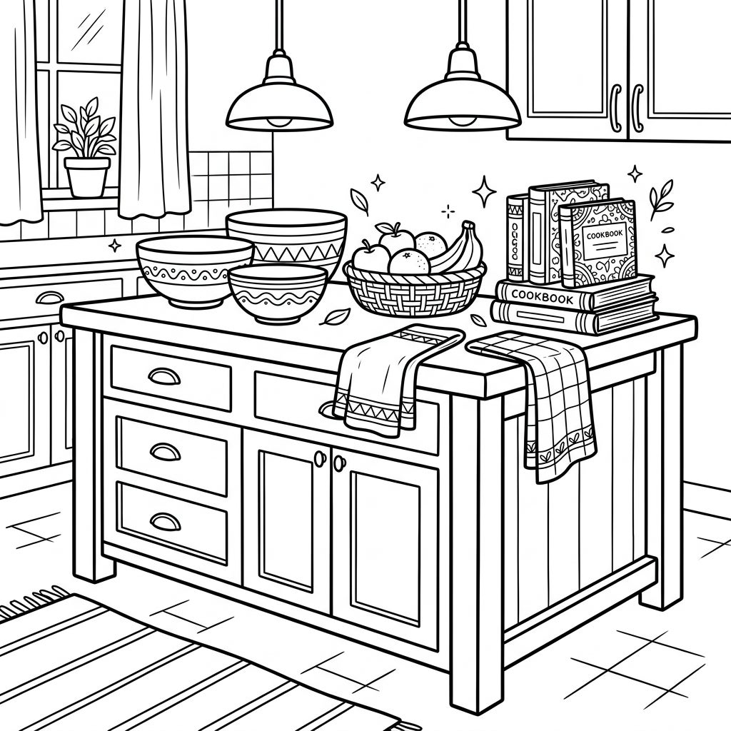 Immerse yourself in the heart of the home with this inviting kitchen island coloring page. The central island, complete with drawers and cabinets, is generously laid out with household essentials. You'll find a trio of decorative bowls, a bountiful fruit basket overflowing with apples and bananas, and a neat stack of cookbooks, all rendered with large, clear outlines for effortless coloring. Two patterned kitchen towels add a touch of domestic charm, while background elements like window curtains, a potted plant, and overhead pendant lights complete the warm, familiar setting.