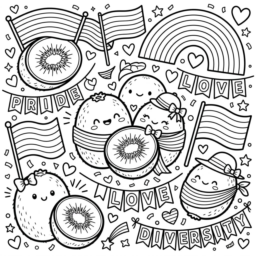 Dive into a delightful world where adorable kiwis celebrate Pride with joy and color. This charming coloring page features kawaii kiwis amidst rainbows, flags, and banners proclaiming love and diversity.