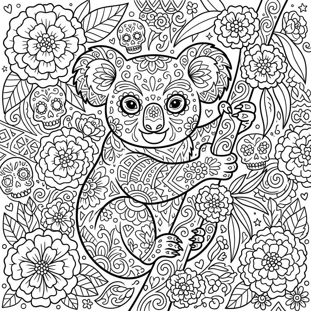Dive into a world of intricate detail with our 'Koala Day of the Dead' coloring page. This enchanting design features a lovable koala, its fur richly decorated with delicate sugar skull motifs and flowing floral patterns, reminiscent of traditional Dia de los Muertos artistry. The koala clings gently to a branch, surrounded by an abundance of beautifully drawn marigolds, lush leaves, and hidden calaveras that peek from the dense, patterned foliage, creating a truly immersive and detailed scene.