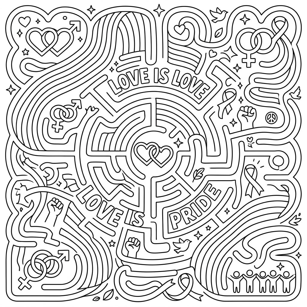 Unfold a world of intricate beauty with this unique Labyrinth Patterns coloring page, a vibrant tribute to Pride Month. The design unfolds as a complex, single-path maze, masterfully weaving together powerful symbols of love and equality. Discover intertwined hearts, gender symbols, doves of peace, raised fists of solidarity, and bold 'Love is Love' and 'PRIDE' text elegantly integrated into the winding pathways, inviting you into a journey of discovery with every stroke.
