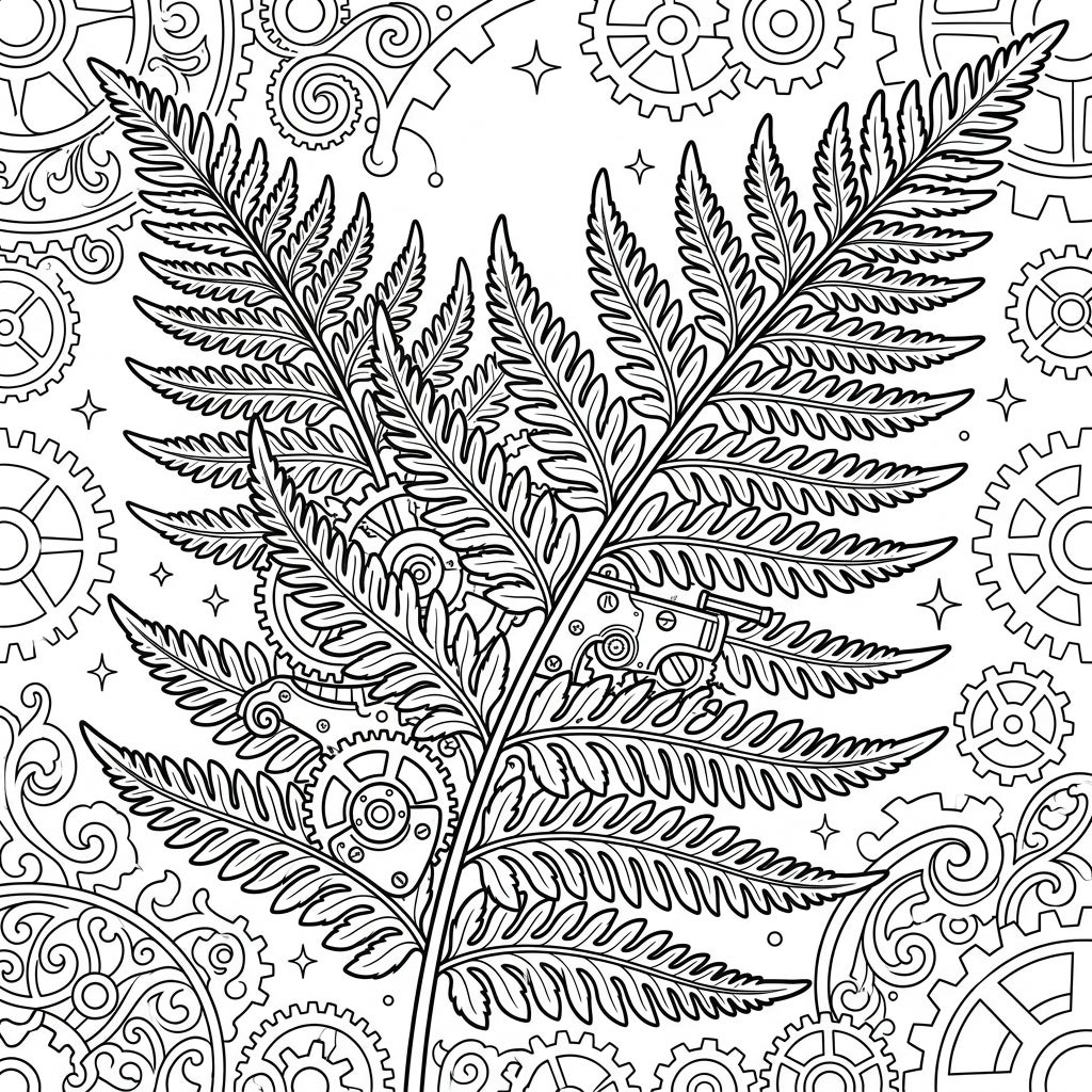 Unleash your creativity and bring this Steampunk vision to life with your chosen palette. Consider metallic shades for the gears and mechanisms – bronzes, coppers, and silvers – to truly capture the Steampunk vibe, contrasting beautifully with vibrant greens for the fern itself. Experiment with shading to add depth and dimension to the intricate details, making each element pop. This page promises a truly engaging and rewarding coloring experience for enthusiasts of both nature and fantasy.