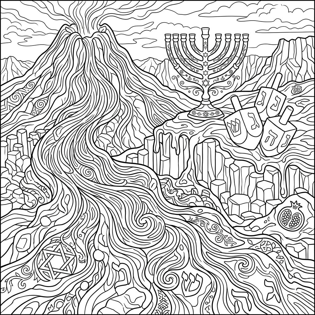 Dive into a truly unique artistic experience with our Hanukkah Lava Flow coloring page, blending natural wonders with traditional celebrations. This captivating design features molten rock transforming into sacred symbols, offering an engaging challenge for colorists of all levels.