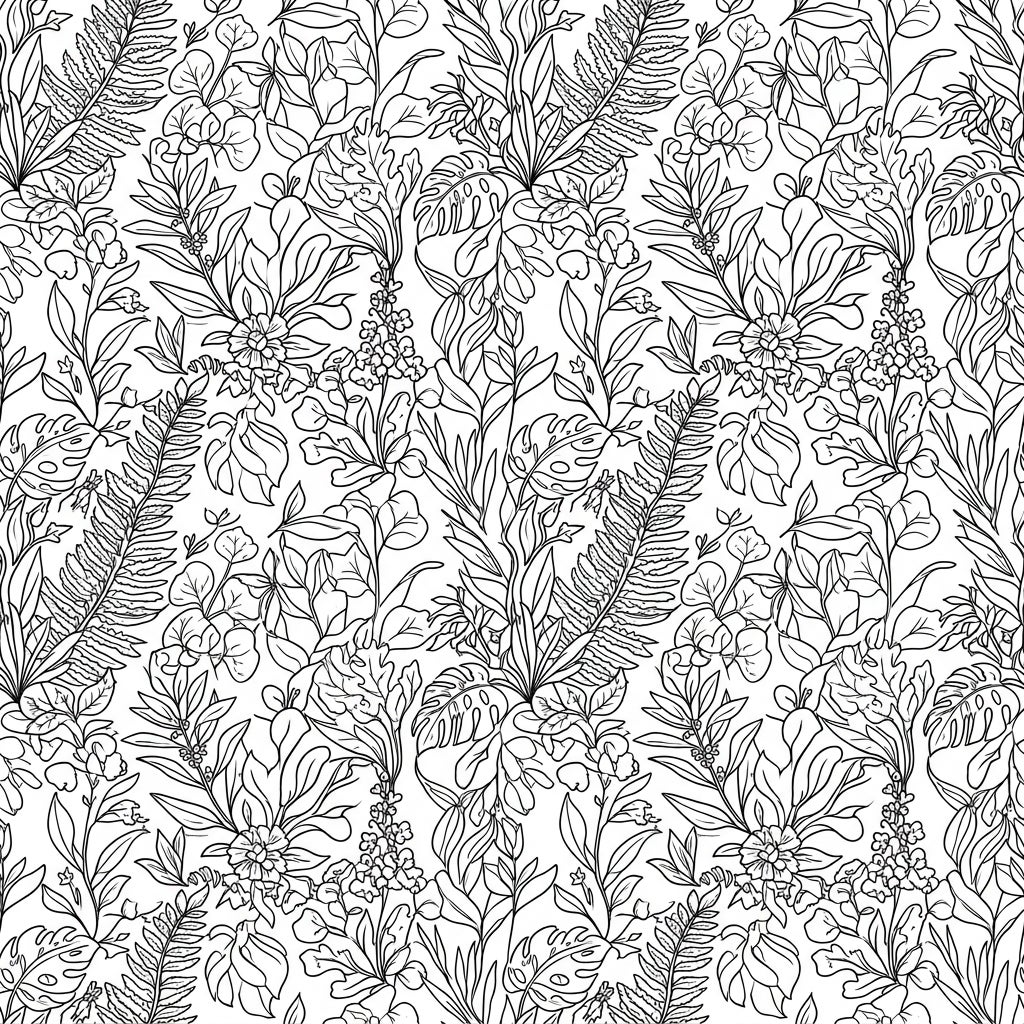 Immerse yourself in the serene beauty of nature with this exquisite botanical leaf line art pattern coloring page. This design features a rich tapestry of various foliage, including delicate ferns, broad monstera leaves, and a myriad of other lush botanical elements. The continuous, repeating pattern ensures every inch of the page is filled with intricate details, inviting you to explore the subtle curves and defined edges of each leaf and stem.