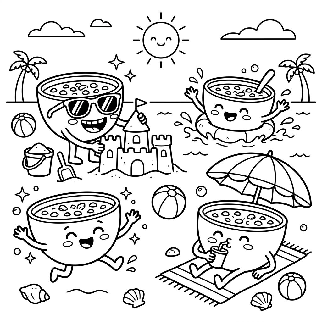 This delightful coloring page brings to life a whimsical summer day at the beach, starring four charming anthropomorphic lentil soups. Each bowl of soup boasts a happy face, expressive arms, and tiny legs, showcasing unique personalities. One energetic soup is busy constructing a grand sandcastle with a bucket and shovel nearby, while another gleefully splashes in the ocean waves, safely nestled in an inner tube. On the sandy shore, a third soup joyfully dashes along, and a fourth lounges serenely on a striped beach towel, sipping a refreshing drink under a classic beach umbrella. The scene is brimming with playful details like beach balls, scattered seashells, and graceful palm trees, all under the cheerful gaze of a smiling sun.