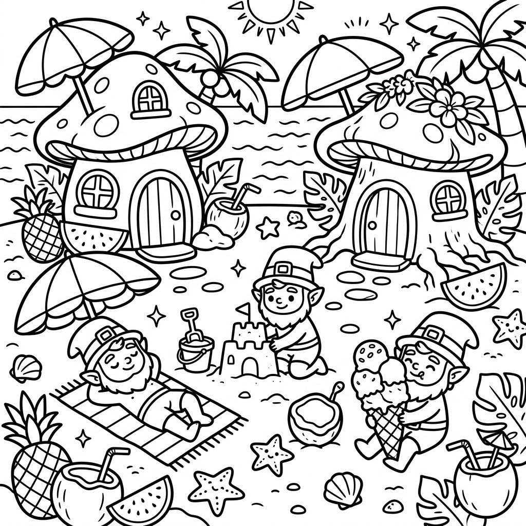 Step into a whimsical world where leprechauns trade their rainbows for sunshine! This delightful coloring page captures the ultimate summer getaway, featuring two quaint leprechaun cottages designed as a mushroom and a tree stump, perfectly nestled on a sandy beach. Explore the lively scene with three cheerful leprechauns: one soaking up the rays on a comfy towel, another meticulously crafting a sandcastle, and a third happily indulging in a towering ice cream cone. The foreground is brimming with tropical delights like juicy pineapples, refreshing coconuts, and sweet watermelon slices, inviting you to color a truly magical summer day.