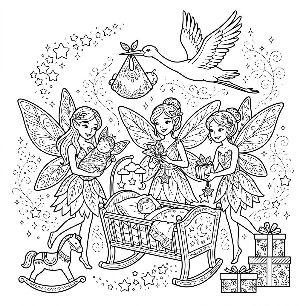 Unveil a heartwarming scene where three radiant Light Fairies are joyfully celebrating a baby shower. In the foreground, one benevolent fairy cradles a tiny, swaddled newborn, while another tenderly watches over a sleeping baby in an ornate rocking crib. A third fairy arrives, gracefully presenting a charming gift, all under the watchful flight of a stork carrying a precious baby bundle. The intricate line art beautifully captures a whimsical rocking horse and additional wrapped presents, set against a backdrop of twinkling stars and delicate, ethereal swirls, creating a truly magical tableau.