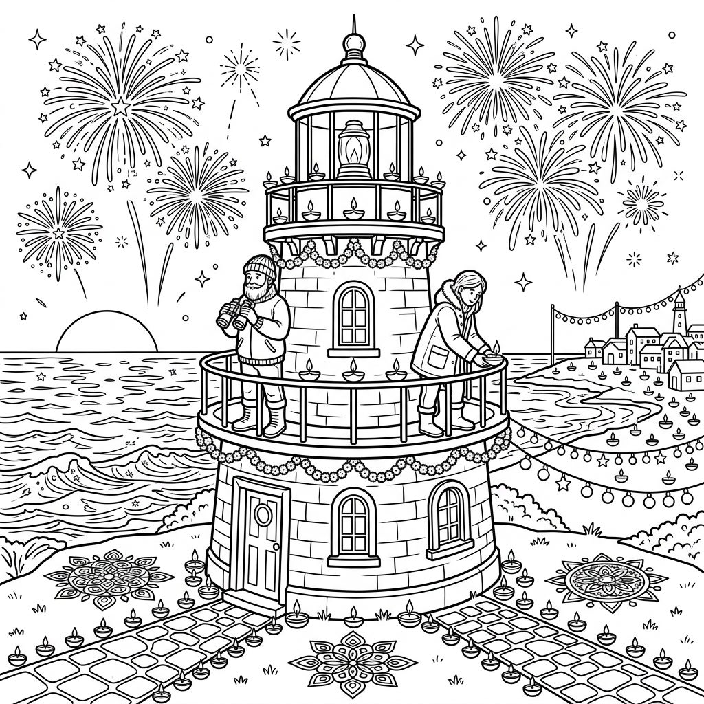 Experience the joyous spirit of Diwali, the Festival of Lights, as it illuminates the solitary yet essential role of lighthouse keepers. This page captures the essence of celebration, bringing together the guiding light of the lighthouse with the symbolic lamps of Diwali. Fireworks burst across the night sky, adding a spectacular display of color and movement (once you color them!). It's a heartwarming blend of tradition, duty, and dazzling festivity, inviting you to reflect on the themes of light, hope, and new beginnings.