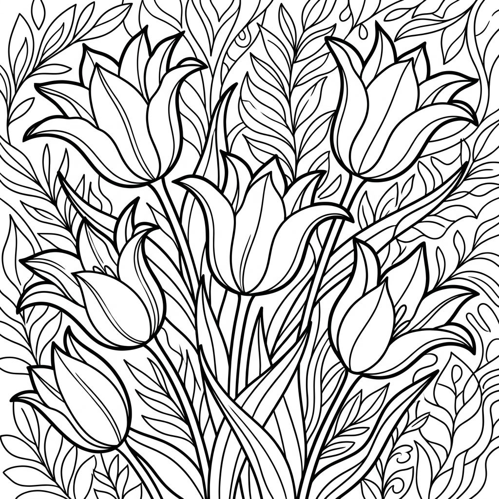 Step into a world of floral beauty with this delightful Lily-Flowered Tulips coloring page! Designed with balanced line weights and moderate detail, this illustration features several elegant tulips, known for their slender petals that flare outwards, reminiscent of graceful lilies. The entire frame is brimming with these lovely blossoms, nestled amongst a lush backdrop of simple leaves and organic patterns, creating a full and immersive garden scene just waiting for your artistic touch.