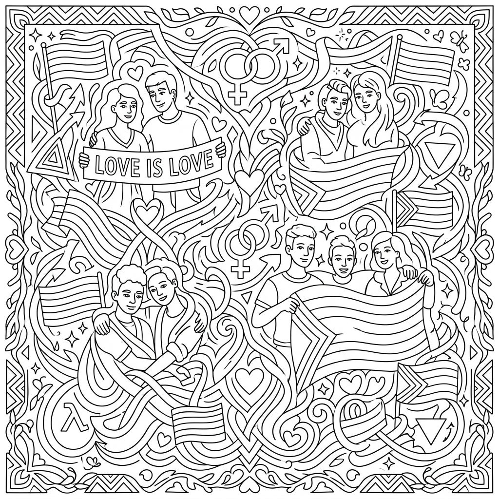 Immerse yourself in a beautifully intricate full-page line art illustration, teeming with symbols of love and acceptance. This detailed coloring page showcases diverse couples and groups of friends, all radiating joy and unity. Woven throughout are numerous Pride flags, hearts, and interlocked gender symbols, alongside a prominent 'Love is Love' banner, inviting you to explore every curve and line.