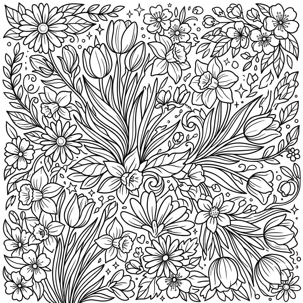 Step into a world bursting with natural beauty with our 'Bloom into Spring' intricate line art coloring page. This stunning design captures the vibrant essence of the season, showcasing a rich array of blooming spring flowers such as elegant tulips, cheerful daffodils, delicate cherry blossoms, and charming daisies. Each element is meticulously rendered with clean, flowing lines, creating a dense, all-over pattern that invites a detailed coloring experience.