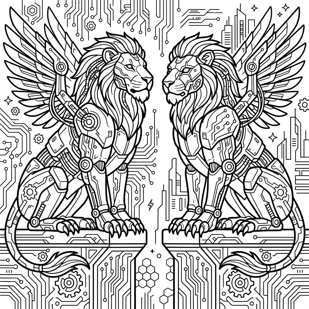 Unleash your creativity with this epic coloring page featuring majestic Lion Gargoyles reimagined in a striking cyberpunk aesthetic. Discover intricate robotic details and high-tech circuitry waiting for your vibrant touch.