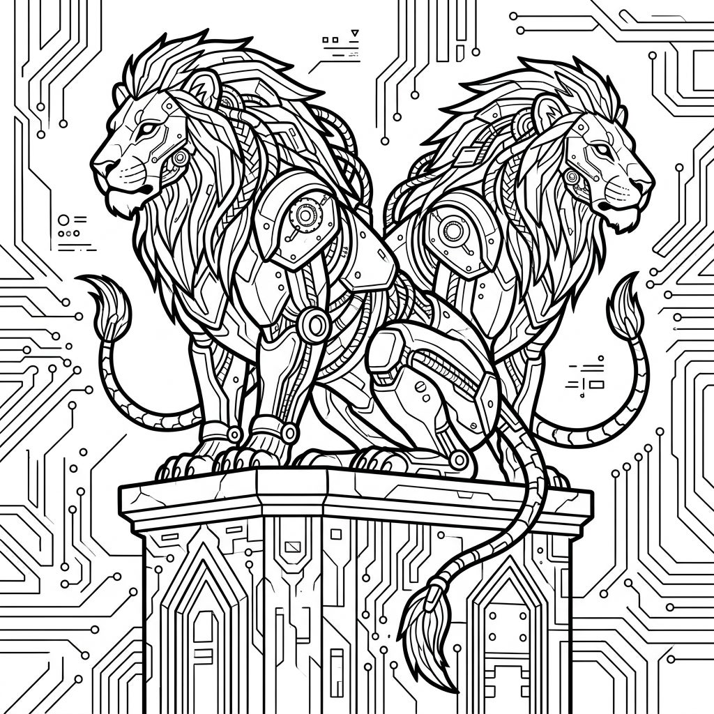 Step into a breathtaking fusion of the mythical and the mechanical with our 'Cyberpunk Lion Gargoyles' coloring page. This intricate design features two majestic lion-like gargoyles, symmetrically posed atop an ornate, tech-infused pedestal. Each creature is a masterpiece of detailed line art, showcasing elaborate robotic plating, visible wiring, and gears that bring a futuristic edge to their ancient form. The dynamic background, filled with circuit board motifs and glowing pathways, perfectly complements the high-tech aesthetic, creating a truly immersive scene ready for your artistic touch.