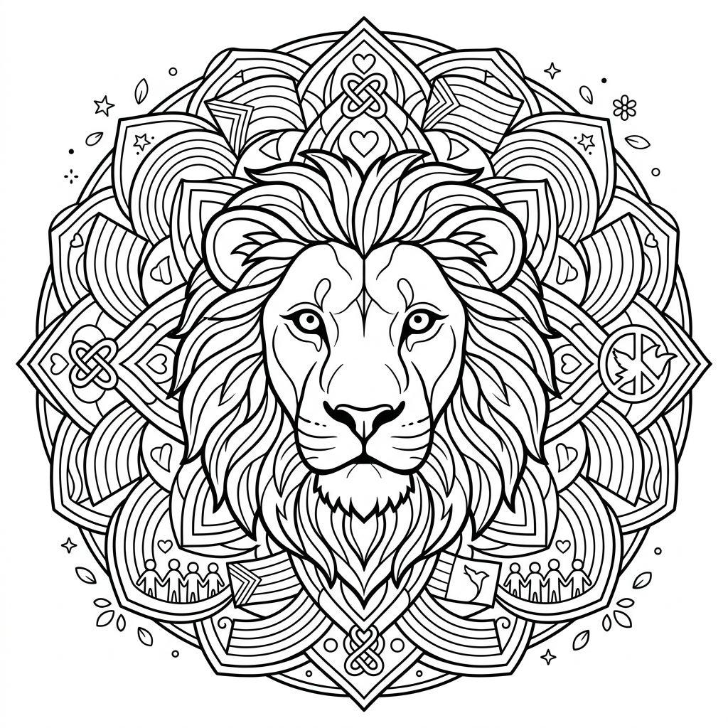 Discover the intricate beauty of this unique coloring page, featuring a majestic lion at its heart, encircled by a stunning mandala. The lion's regal face and flowing mane are meticulously detailed, inviting you to capture its strength with every stroke. Look closely at the concentric layers of the mandala, where you'll find delicate patterns like interwoven hearts, classic Celtic knots, and subtle wavy lines suggesting the vibrant spectrum of a rainbow. Small, meaningful motifs such as figures of people holding hands and a peace symbol are thoughtfully integrated, adding depth and narrative to your artistic journey.