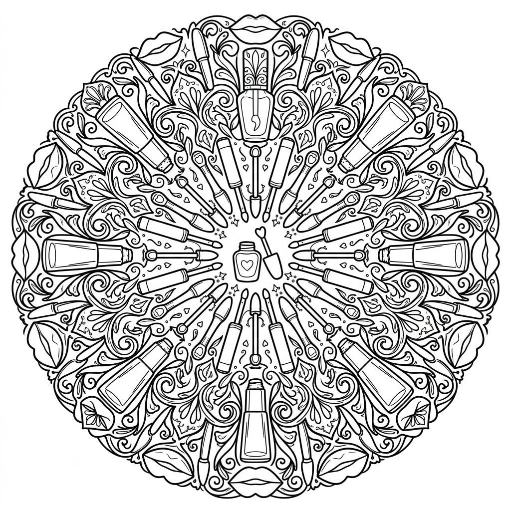 Unleash your inner artist and express your love for all things glam with this unique mandala. It's more than just a coloring page; it's an opportunity to transform an ordinary day into a dazzling escape. Imagine the soft pinks, fiery reds, and shimmering golds you can use to make each lip gloss element pop. This design captures the essence of beauty and self-care, offering a delightful way to unwind and focus your creative energy.