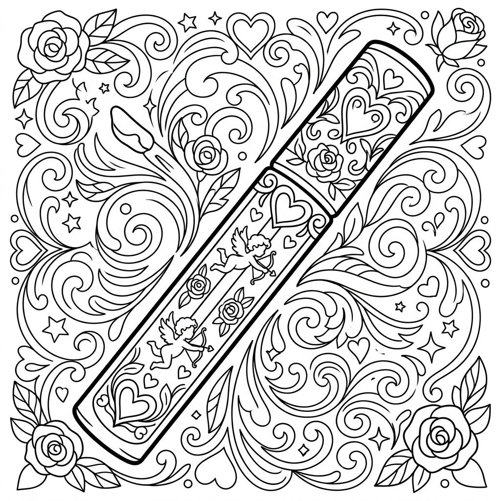 Dive into a world of romantic artistry with this enchanting coloring page, showcasing a chic tube of lip gloss. The central lip gloss is beautifully adorned with classic Valentine's motifs, including delicate hearts, playful cupids aiming their bows, and elegant roses. Every detail on the lip gloss itself, from the cap to the applicator, invites your creative touch, making it a focal point of beauty and affection.