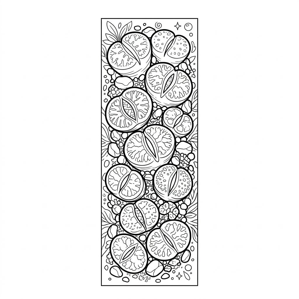 Dive into the fascinating world of Lithops with this unique coloring bookmark! This intricate design showcases a captivating arrangement of these 'living stones,' known for their remarkable camouflage. Each Lithops is depicted with its distinctive cleft and textured surface, inviting you to explore the subtle variations in their forms. Surrounding these succulent gems, you'll find an assortment of small pebbles and organic motifs, creating a rich and immersive botanical scene that extends from top to bottom.