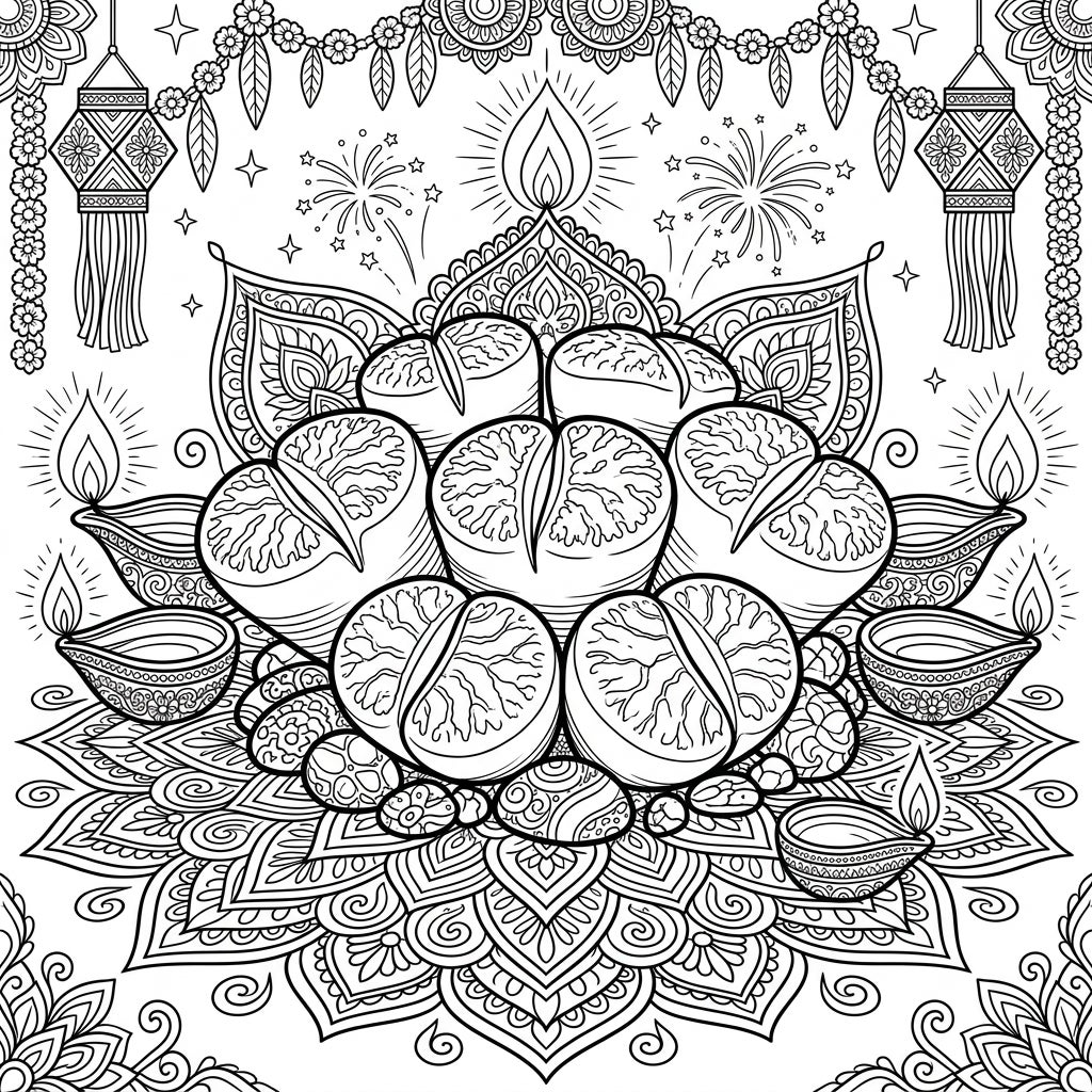 This coloring template beautifully captures the spirit of Diwali, the festival of lights, inviting you to celebrate joy, hope, and new beginnings. The radiant glow of the diyas and the detailed mandalas evoke a sense of tradition and festivity, while the serene Lithops succulents introduce an unexpected yet harmonious touch of natural wonder. It’s a design that speaks to both the vibrant celebration of culture and the quiet beauty found in the botanical world, creating a peaceful yet exhilarating scene to bring to life with color.