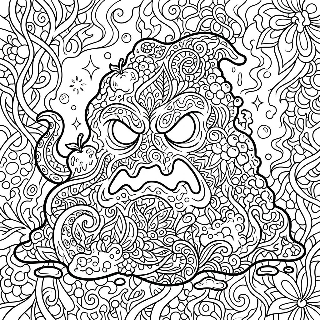 Prepare to be mesmerized by this extraordinary Living Sludge Zentangle coloring page. At its heart lies a formidable, amorphous creature, its angry eyes and scowling mouth giving it a surprisingly expressive, albeit monstrous, presence. Every inch of its 'sludgy' form is transformed into a canvas of complex Zentangle patterns, weaving together delicate swirls, floral motifs, abstract lines, and subtle hints of decay like apples and bubbles, all meticulously rendered.