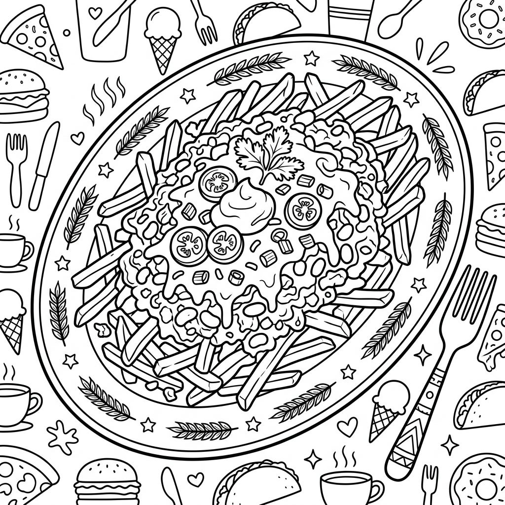 This coloring page evokes the ultimate comfort food experience, celebrating the joyous indulgence of a classic snack. Imagine the warmth of the chili, the crispness of the fries, and the creamy texture of the cheese as you meticulously fill in each section. It's a perfect activity for foodies, snack lovers, or anyone looking for a fun and relaxing artistic escape that celebrates deliciousness. Whether it's a cozy evening in or a creative break, this template promises a delightful journey into the world of indulgent treats.