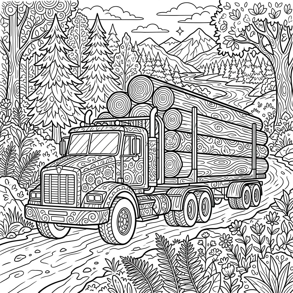 This design offers more than just a coloring activity; it's an immersive experience crafted for adult enthusiasts seeking both challenge and relaxation. Lose yourself in the meditative process of bringing this demanding wilderness scene to life, finding peace and focus as you meticulously choose colors for the sturdy truck, the textured logs, and the vibrant natural landscape. It's an ideal way to unwind, de-stress, and tap into your creative potential after a long day.