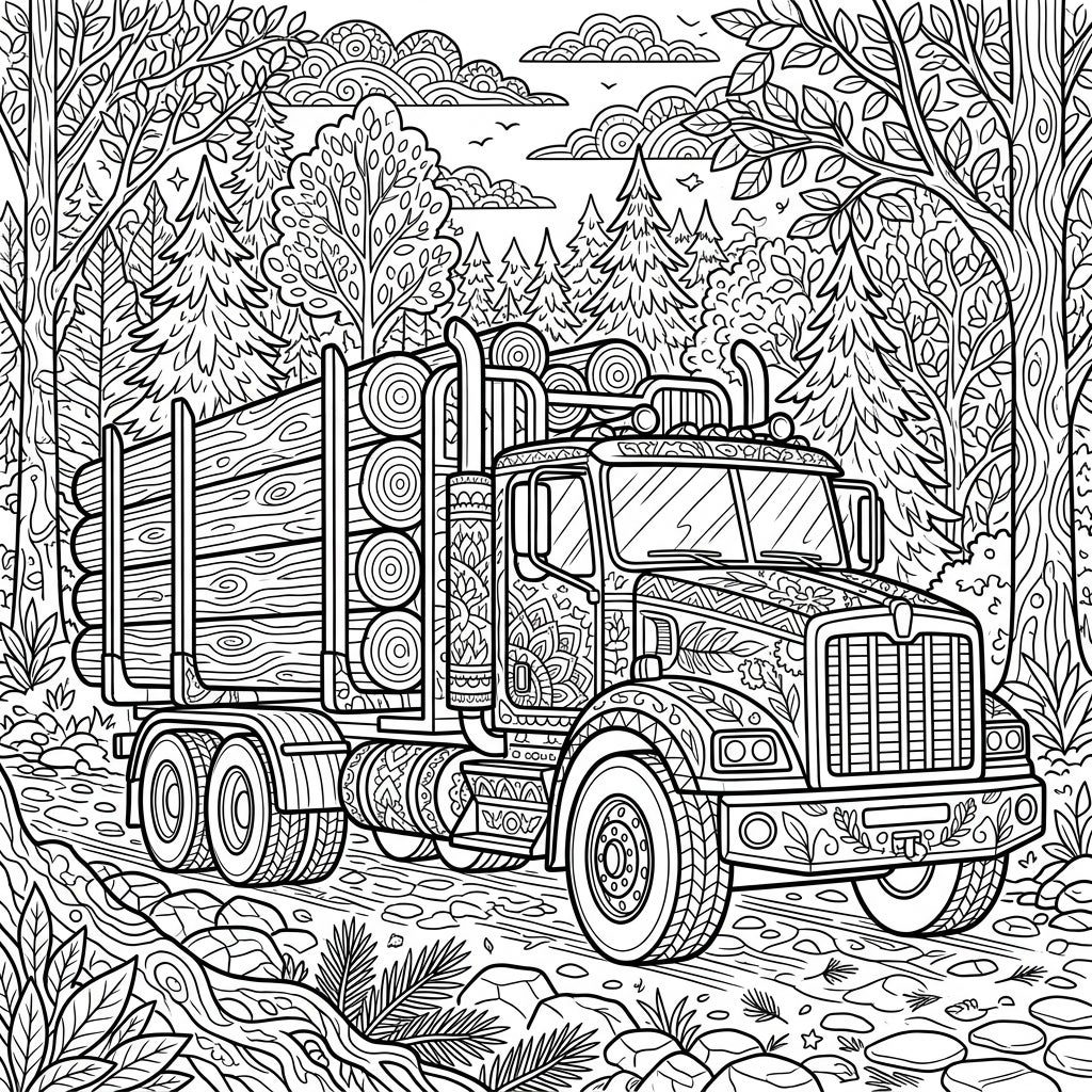 Embark on a unique artistic journey with this adult coloring page featuring a magnificent logging truck. Discover intricate patterns woven into its design, set against a beautifully detailed forest backdrop.
