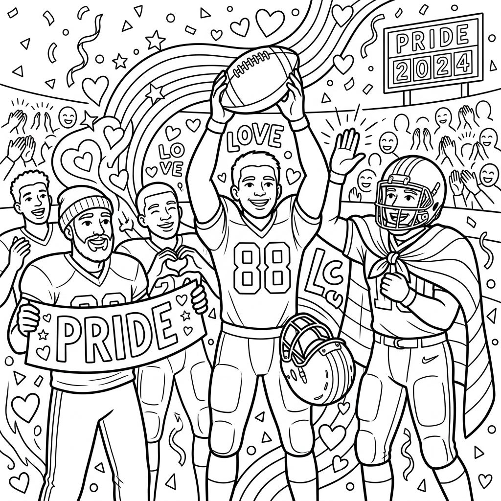 This coloring page beautifully intertwines the thrilling world of football with the vibrant spirit of Pride Month. It's a powerful visual representation of inclusivity, celebrating athletic passion alongside themes of love, diversity, and community. Imagine the stadium alive with color, cheering on not just the game, but also the universal message of acceptance. This scene captures a moment of pure joy and solidarity, inviting colorists to reflect on the importance of celebrating every individual and every touchdown of equality.