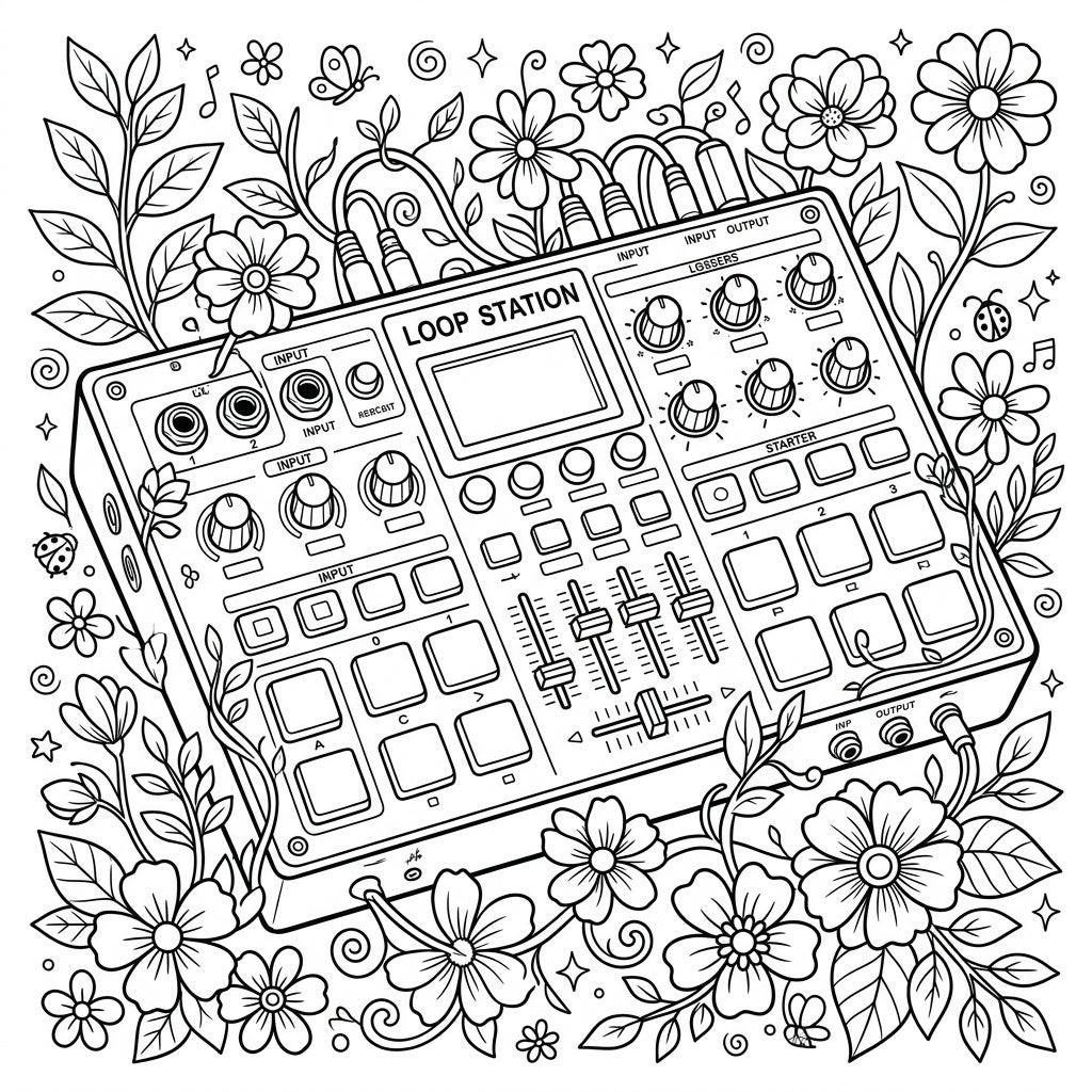 Unleash your creativity with this unique coloring page featuring an electronic loop station adorned with beautiful spring elements. Perfect for music lovers and nature enthusiasts alike, it offers a harmonious blend of technology and blooming beauty.