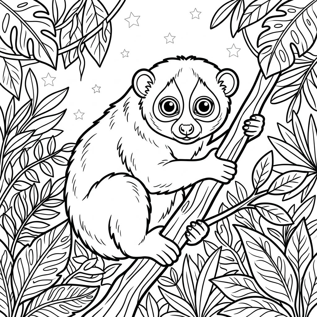 This captivating coloring page presents an adorable loris, the heart of a lush tropical scene. With its characteristically large, curious eyes and gentle demeanor, the loris is depicted clinging to a sturdy tree branch, perfectly poised for a splash of color. Surrounding this nocturnal charmer is a rich tapestry of diverse tropical foliage, from broad monstera-like leaves to intricate ferns, all designed with clean, inviting lines that promise a satisfying coloring experience. A scattering of delicate stars in the background hints at its nighttime habitat, adding a touch of wonder to the overall design.