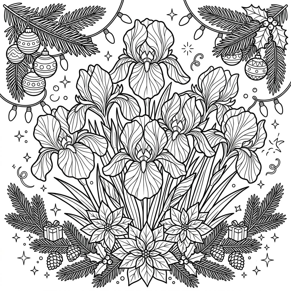 Let your imagination bloom as you bring this extraordinary scene to life with your favorite colors. Consider using classic reds and greens for the Christmas elements, vibrant purples and yellows for the Louisiana Irises, or experiment with a harmonious pastel palette for a softer look. This page offers ample opportunity for detailed shading on the petals and ornaments, allowing you to create depth and texture, making each colored section truly pop. Gather your pencils, markers, or paints and embark on a joyful artistic journey this holiday season!