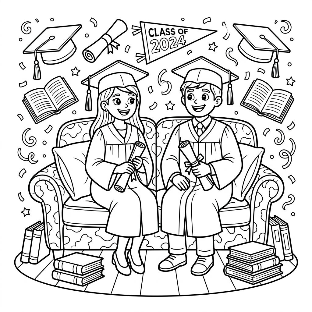 Capture the joy of academic success with this delightful coloring page featuring two graduates on a loveseat, surrounded by festive graduation symbols. It's the perfect way to honor milestones and create a lasting, colorful memory of achievement.